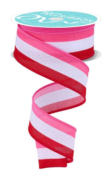 High quality premium USA imported wired ribbon. This ribbon is 1.5" wide, with a 3 in 1 vertical stripe desihn in hot pink, white & red.