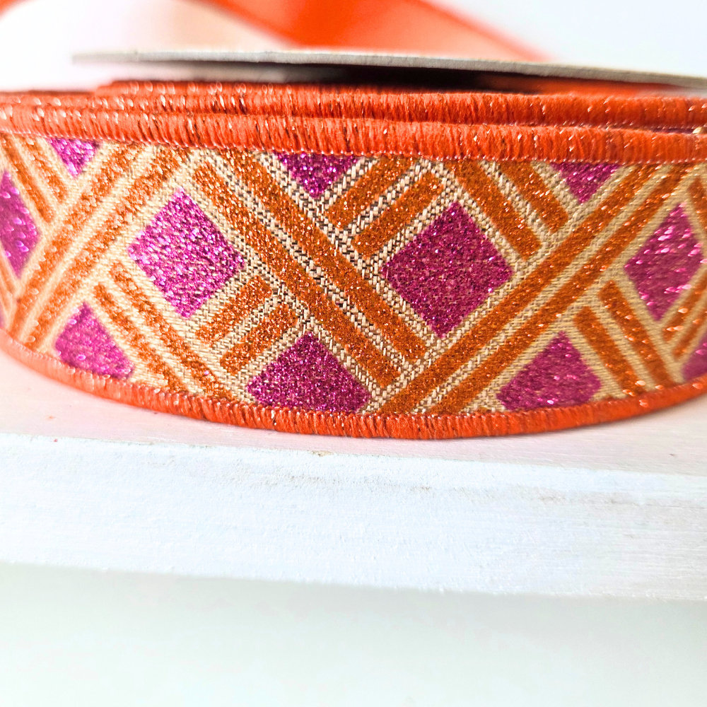 High quality premium USA imported wired ribbon. Deluxe 1.5" wide fused ribbon,with woven stripe design in gold, fuchsia and orange. Sold per meter