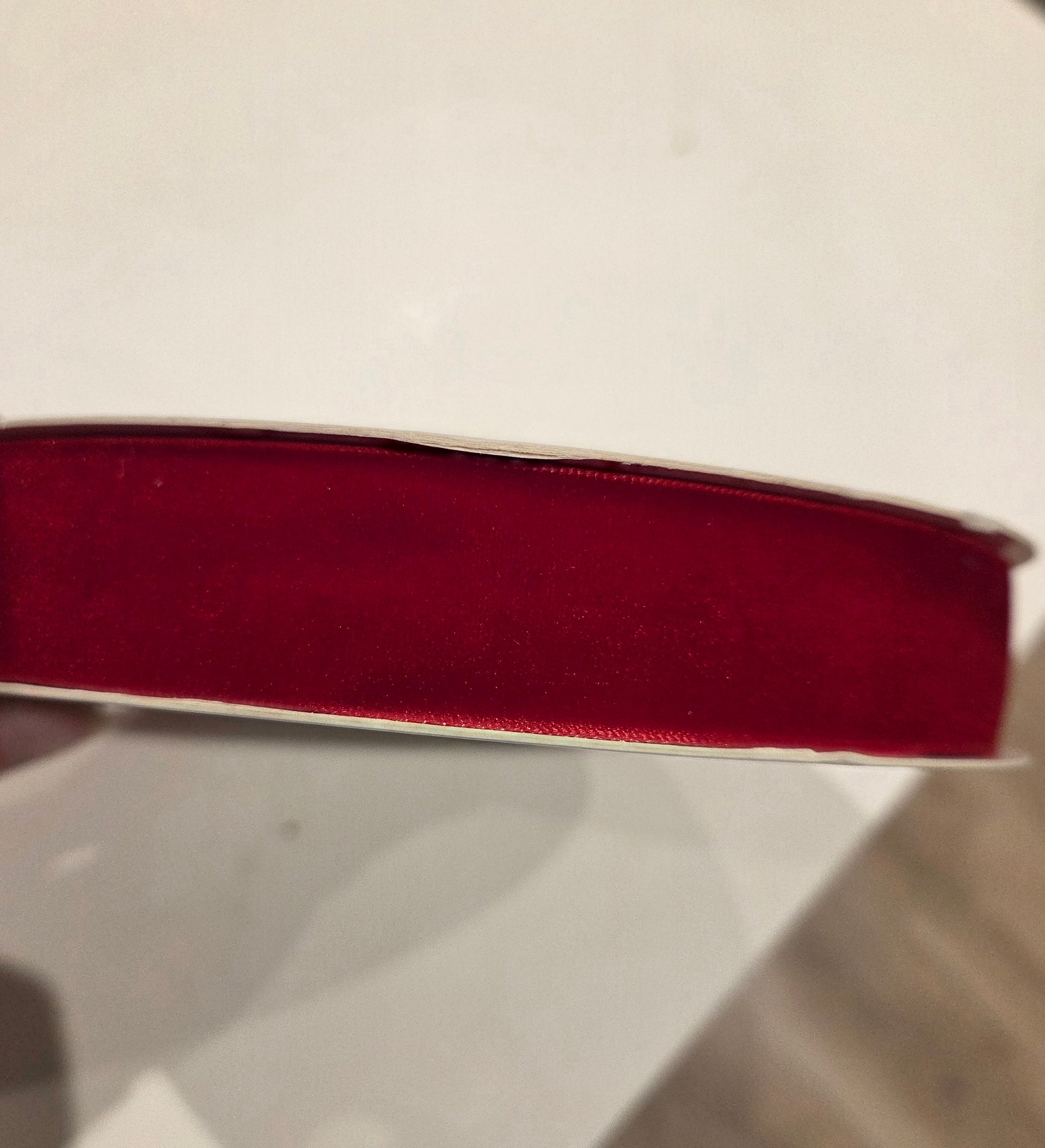 Velvet ribbon (non wired) in traditional Christmas colours (available in red, deep burgundy and deep green). 25mm wide. Sold by the meter